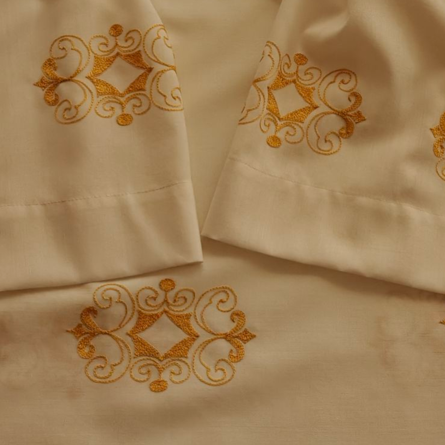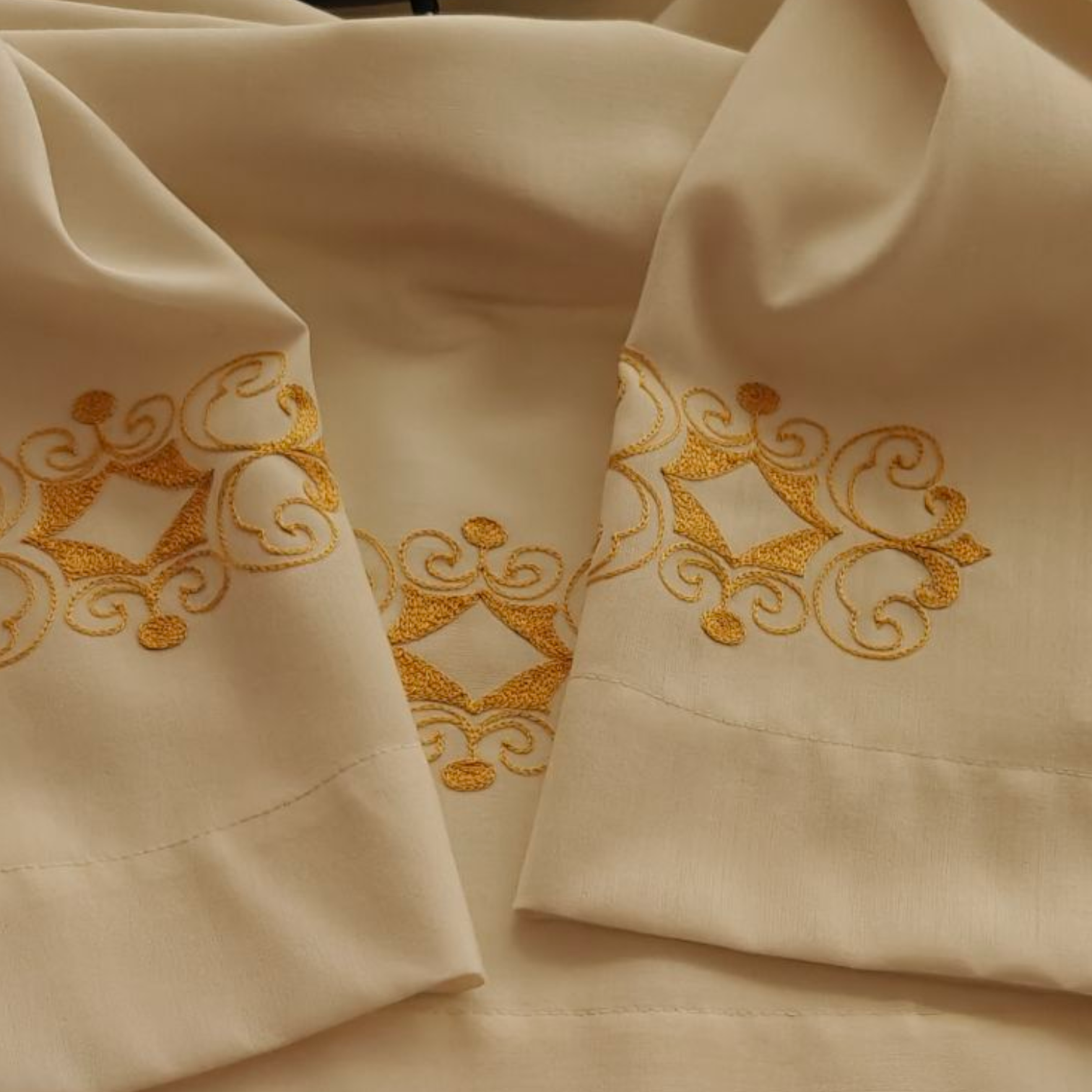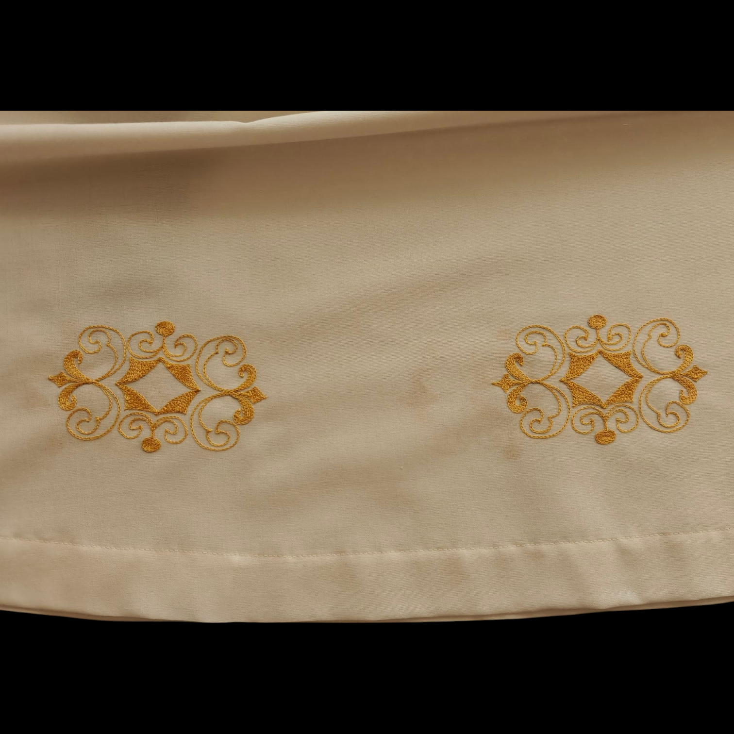 Camice realizzato in pregiato tessuto di pura lana italiana, disponibile in tutti i modelli, come camice e come cotta. Questo ricamo è caratterizzato da un filo di seta in tonalità giallo oro, offrendo eleganza e unicità. Disponibile in tutti i colori liturgici.