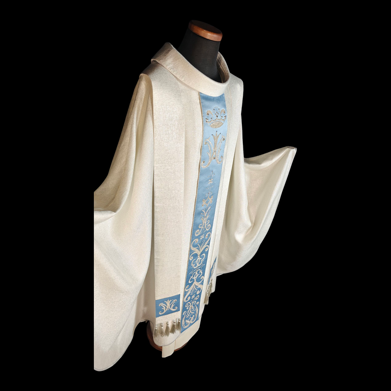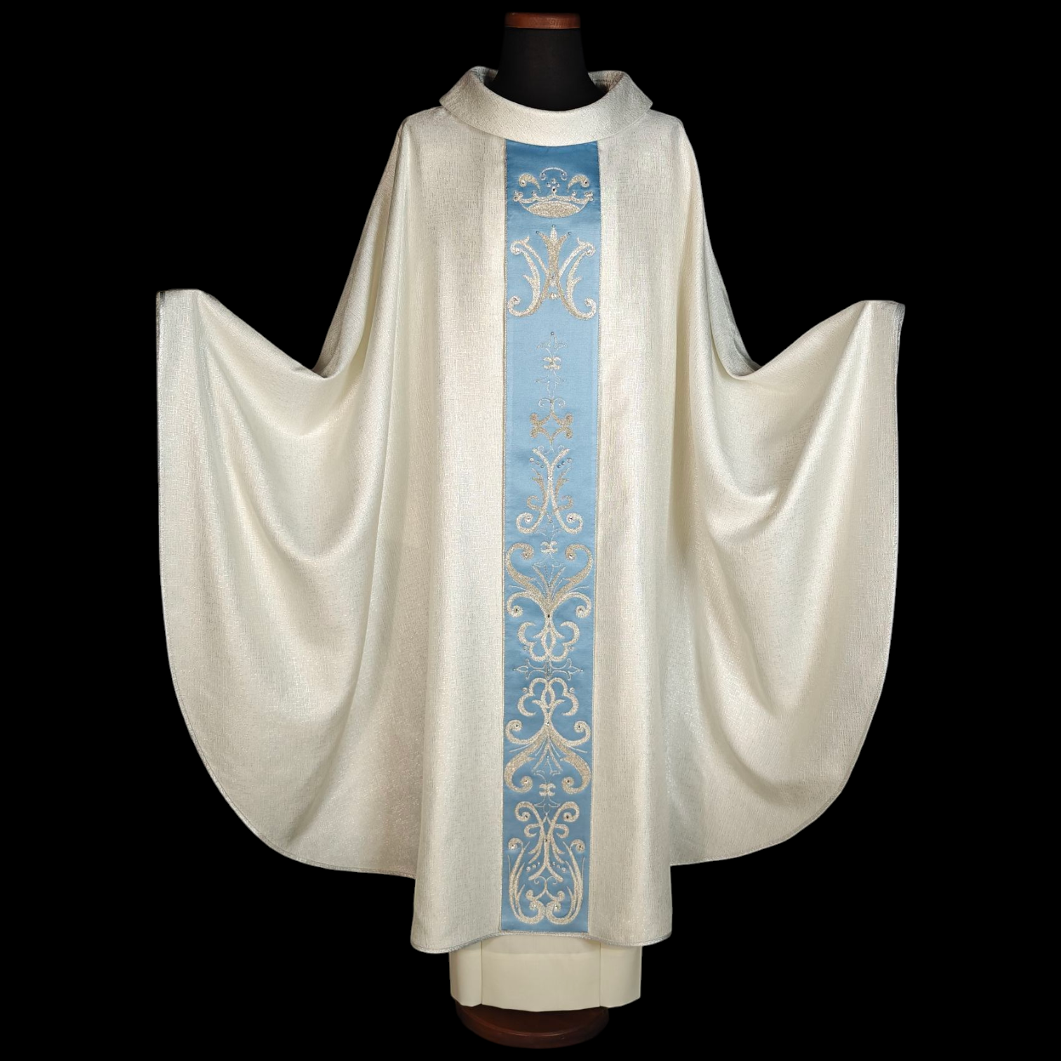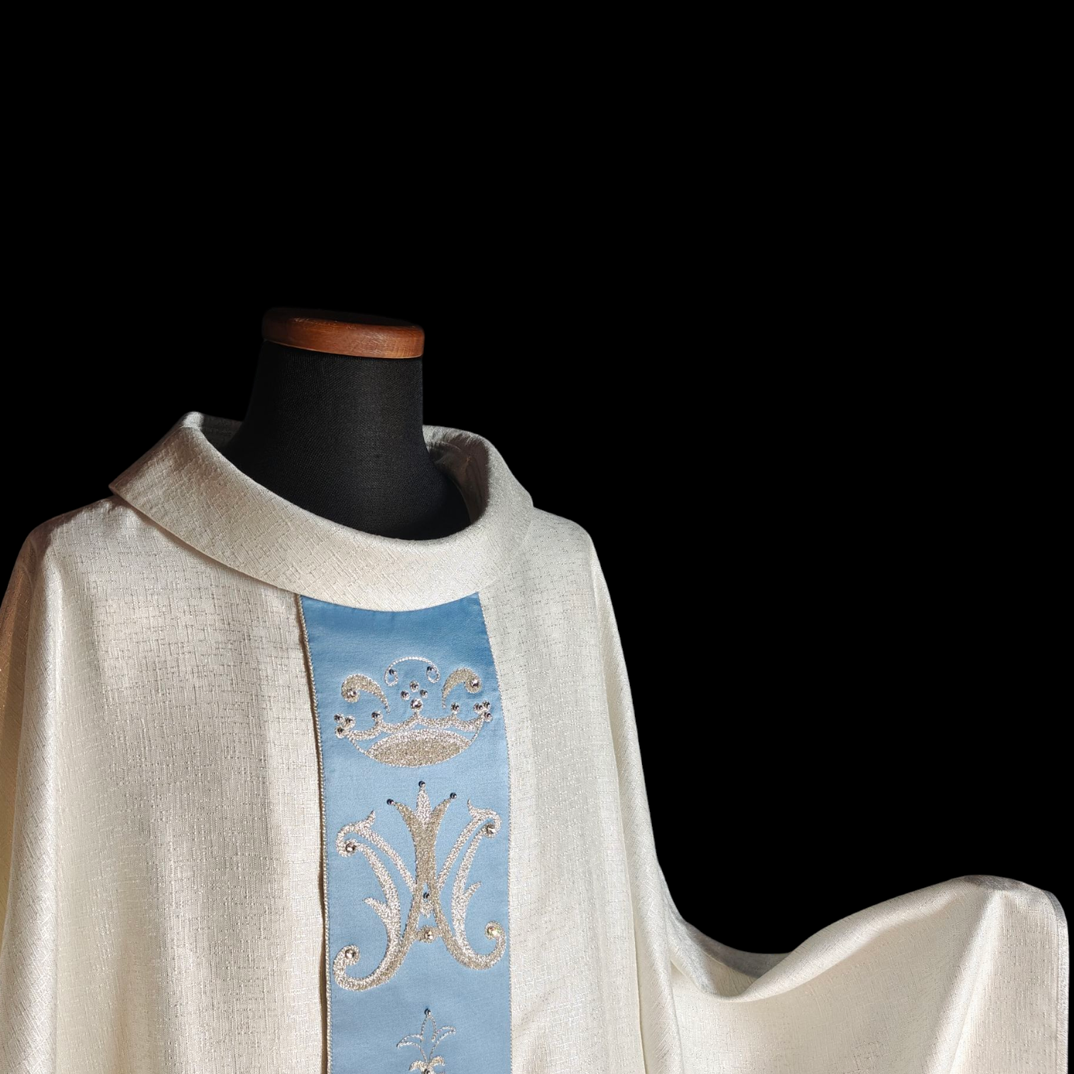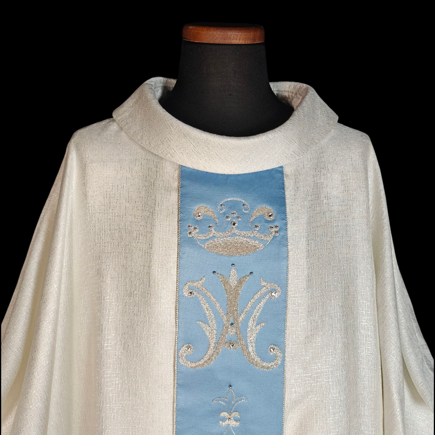 La casula “Santa Chiara” è realizzata in pregiato tessuto faille pioggia, che dona eleganza e resistenza. Lo stolone in cotone satinato aggiunge una finitura morbida e lucente. Il ricamo a telaio moderno introduce dettagli intricati e contemporanei, creando un design sofisticato. Perfetta per celebrazioni solenni, questa casula unisce tradizione e innovazione, esaltando la sacralità del rito con un tocco di raffinatezza e maestria artigianale.