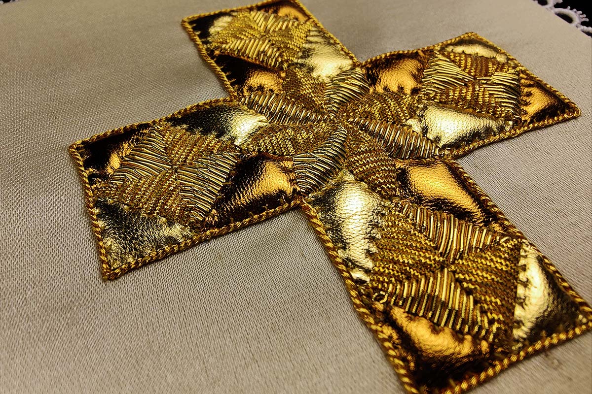 La casula “Sant’Ignazio” è un raffinato paramento liturgico, realizzato in tessuto a rilievo che dona profondità e eleganza. Al centro, una croce impreziosita da un fiore in pelle, decorata con canutiglia lavorata a mano, aggiunge un tocco di maestria artigianale. Questa casula, perfetta per celebrazioni solenni, unisce tradizione e finezza, esaltando la sacralità del rito con la sua bellezza distintiva e i dettagli preziosi.