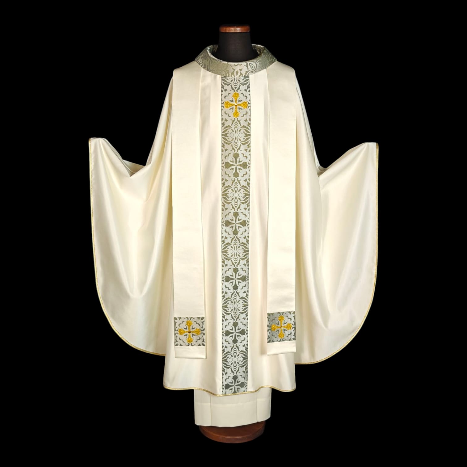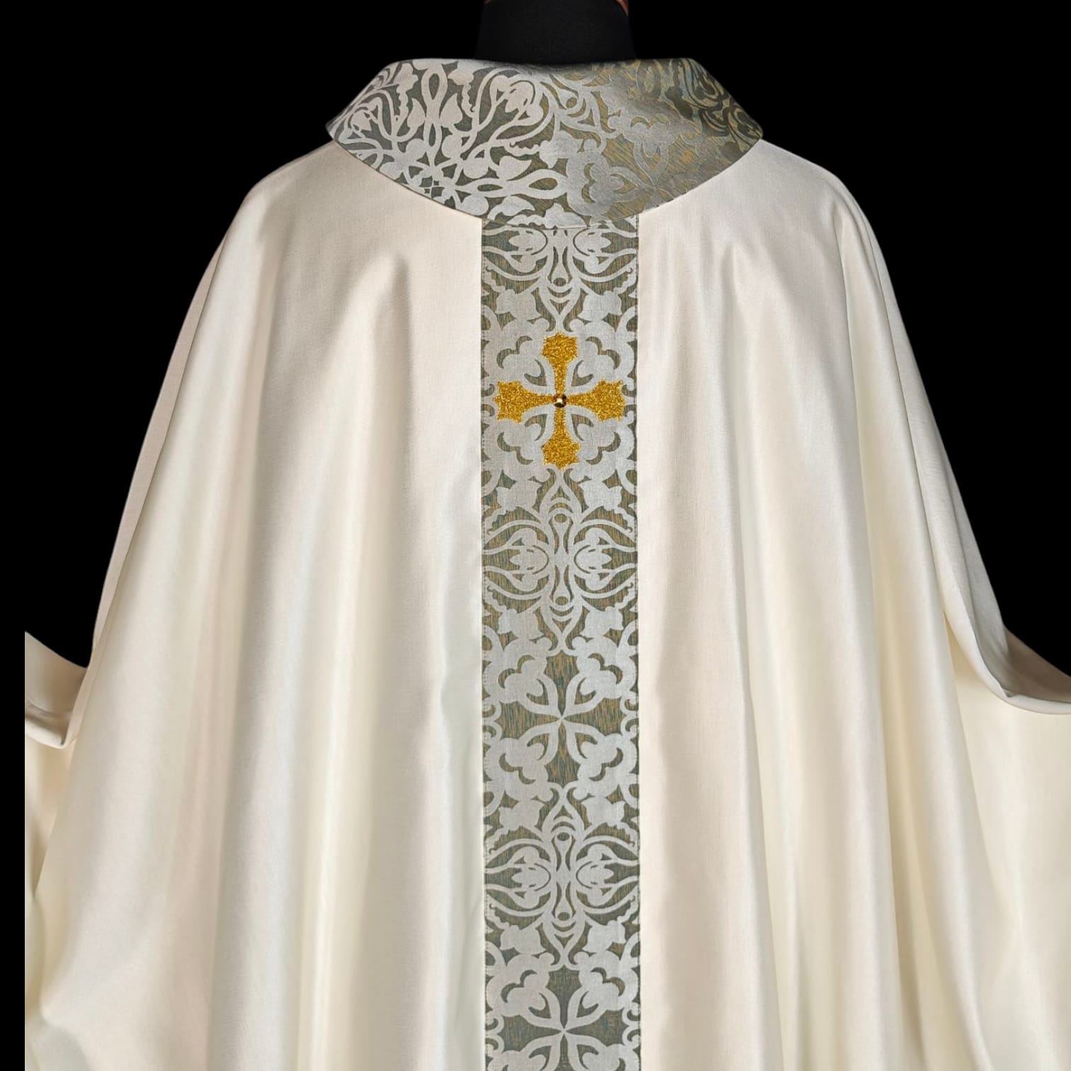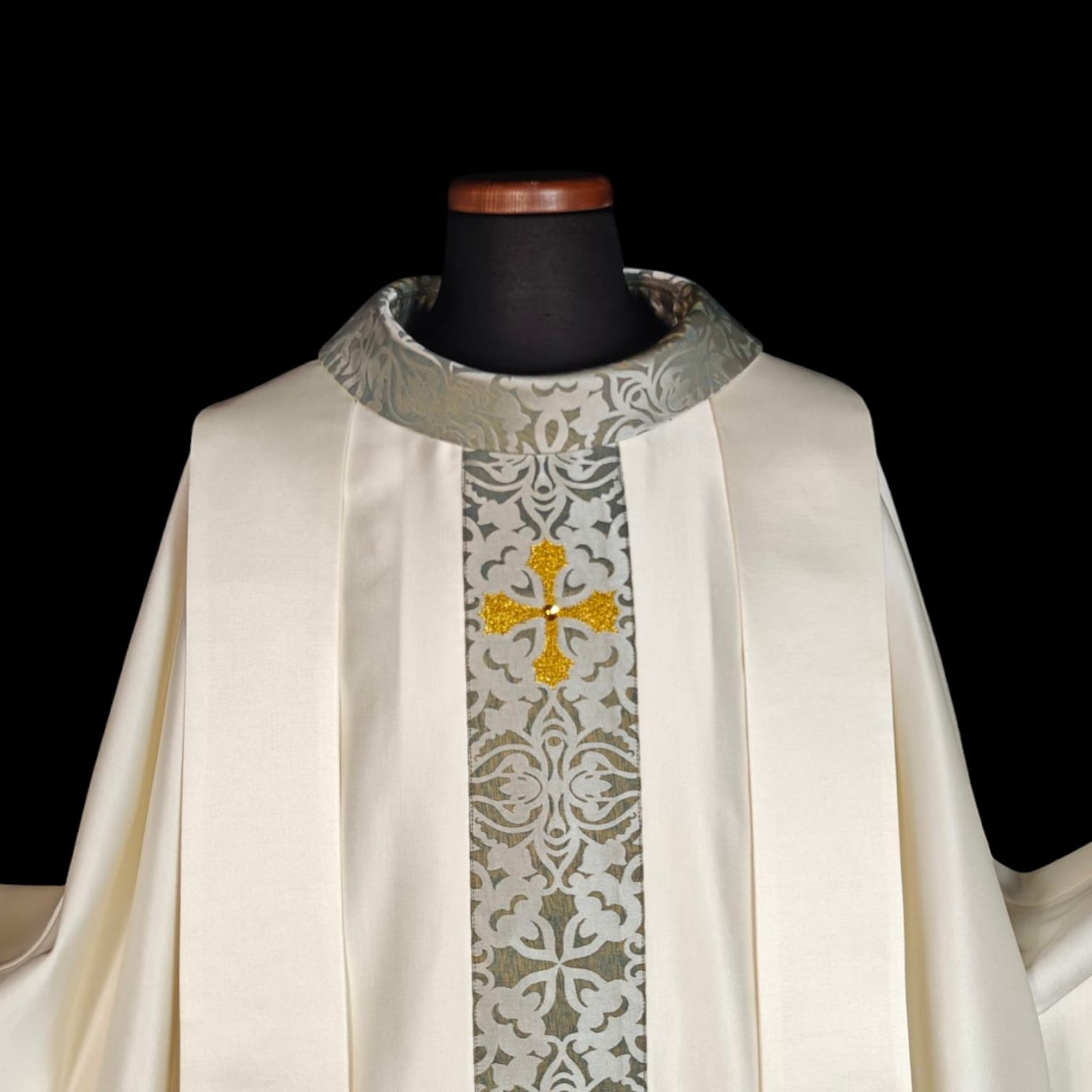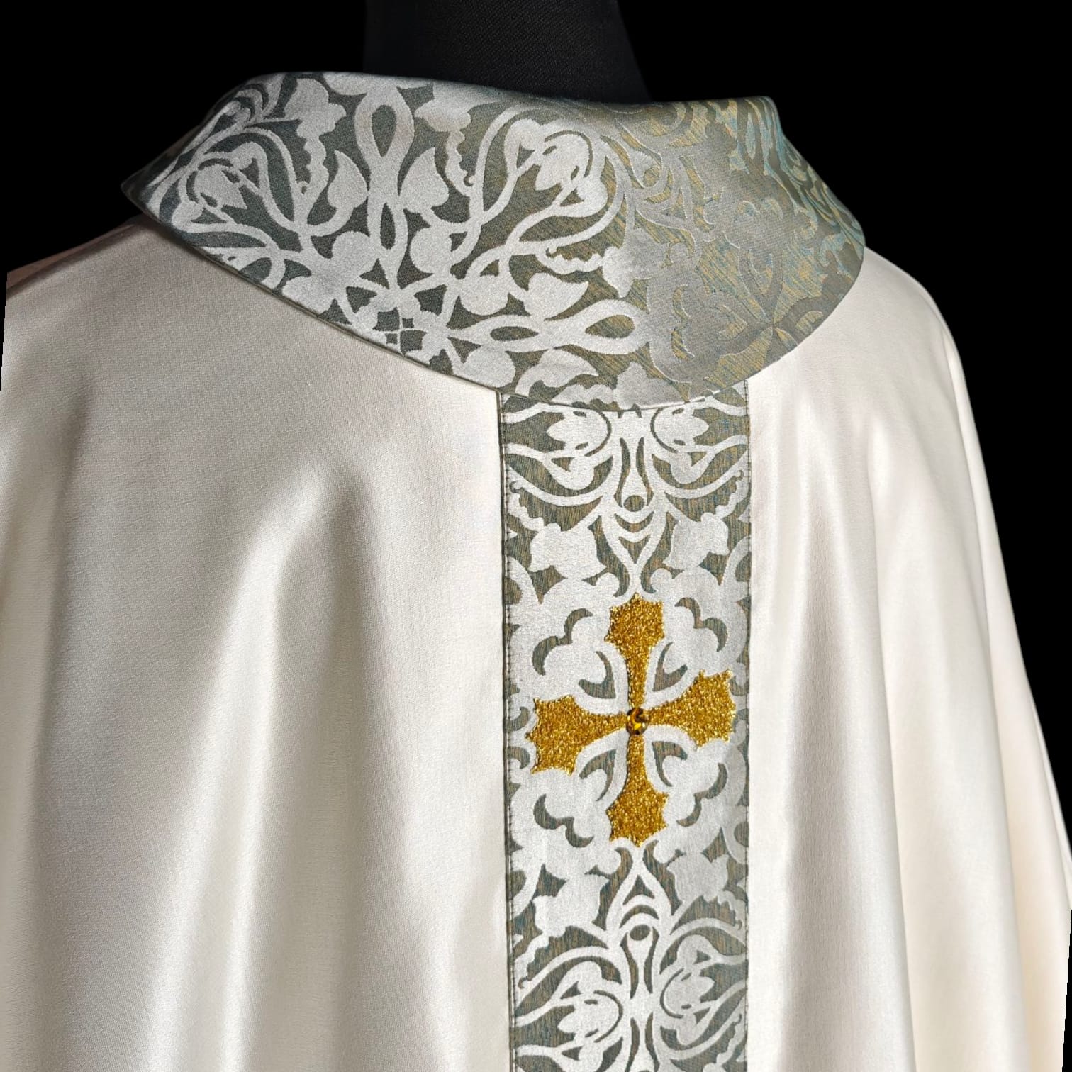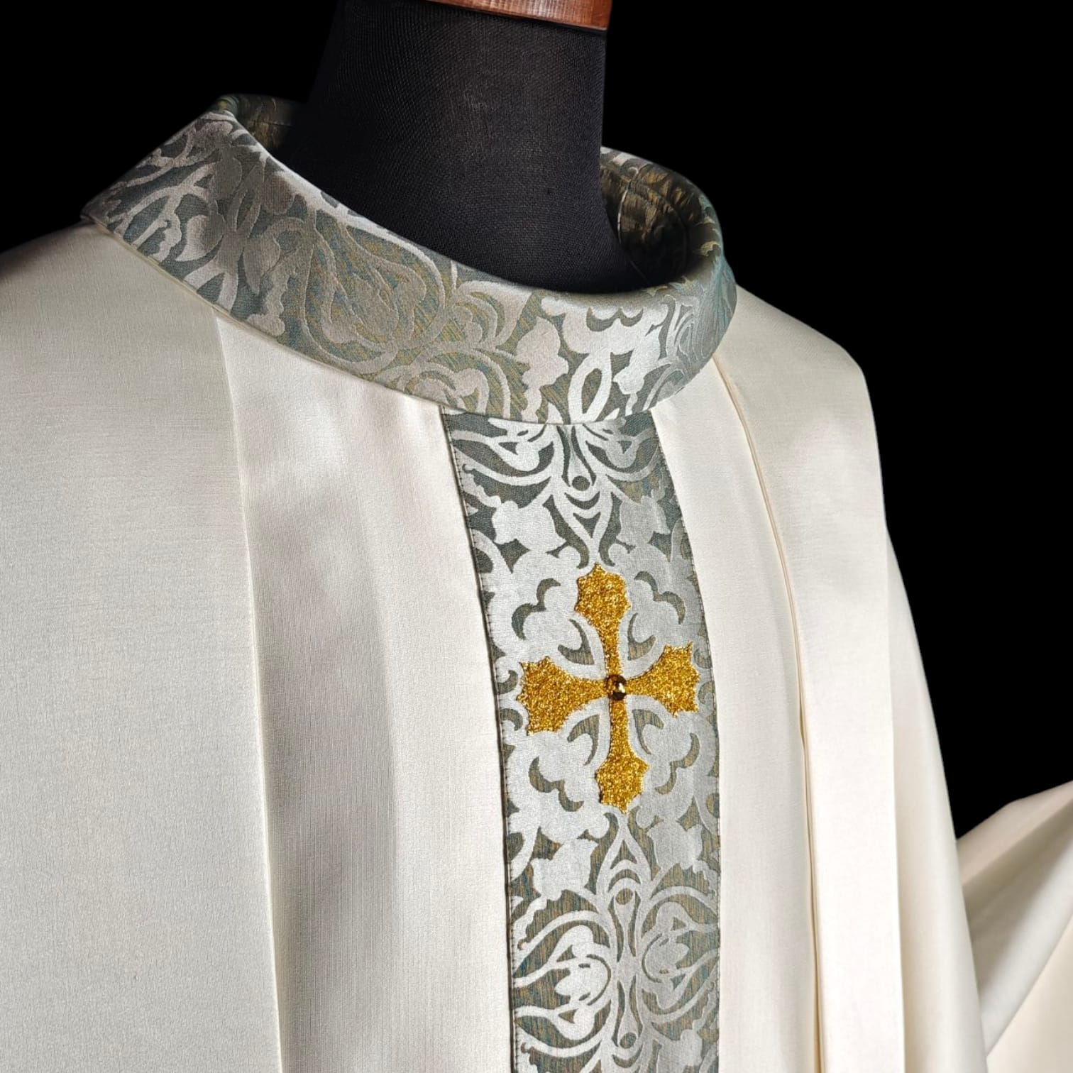 Realizzata in tessuto faille composto da lana e seta, questa casula si contraddistingue per la leggerezza e la praticità, rendendola particolarmente confortevole da indossare. Uno dei suoi elementi distintivi è lo stolone cucito direttamente sulla casula, una soluzione che garantisce maggiore comodità rispetto a quello staccato, senza compromettere la bellezza e la solennità del capo.
