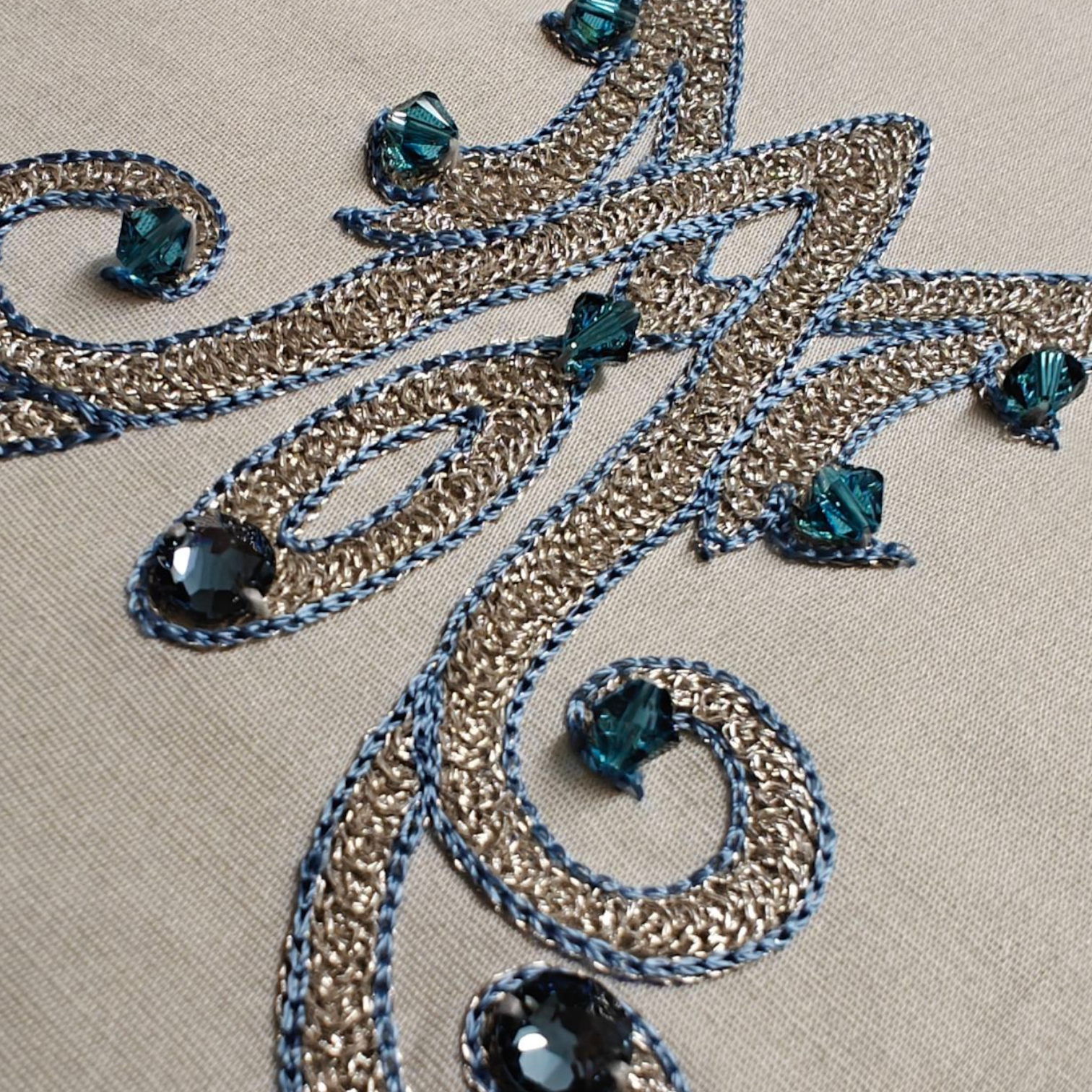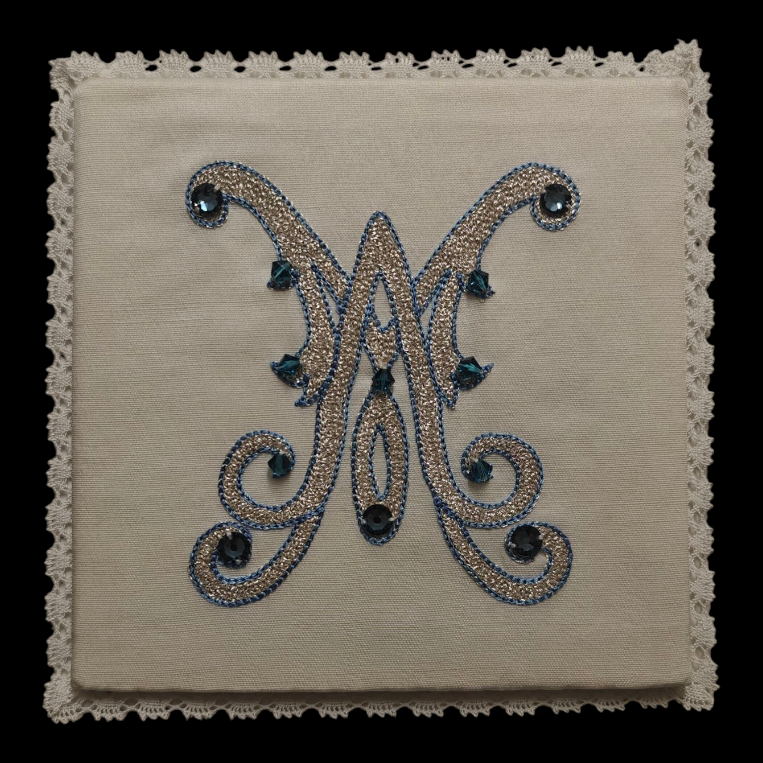 Palla modello Santa Bernadette realizzato su cotone satinato bianco ricamato con filato metallico argento e seta celeste con swarovski certificati cuciti a mano.
