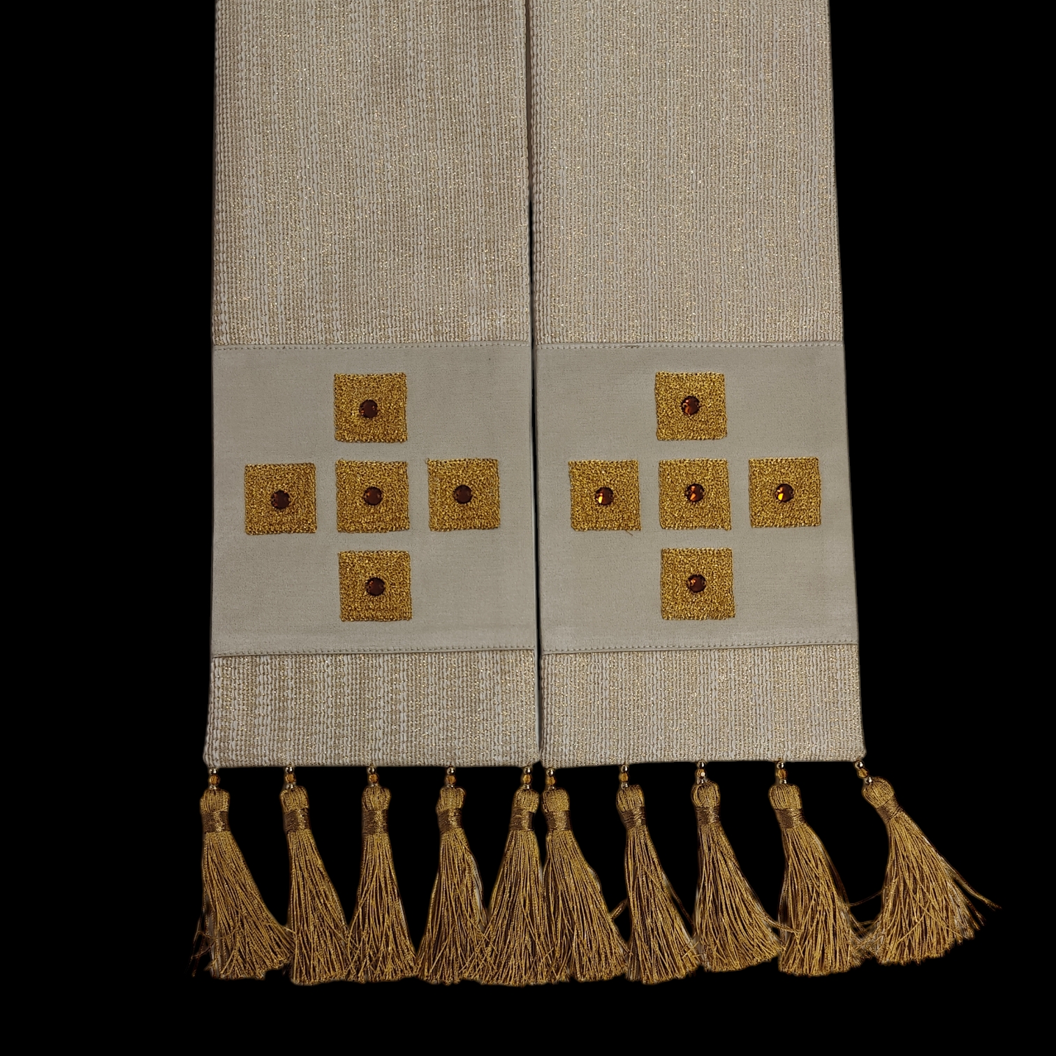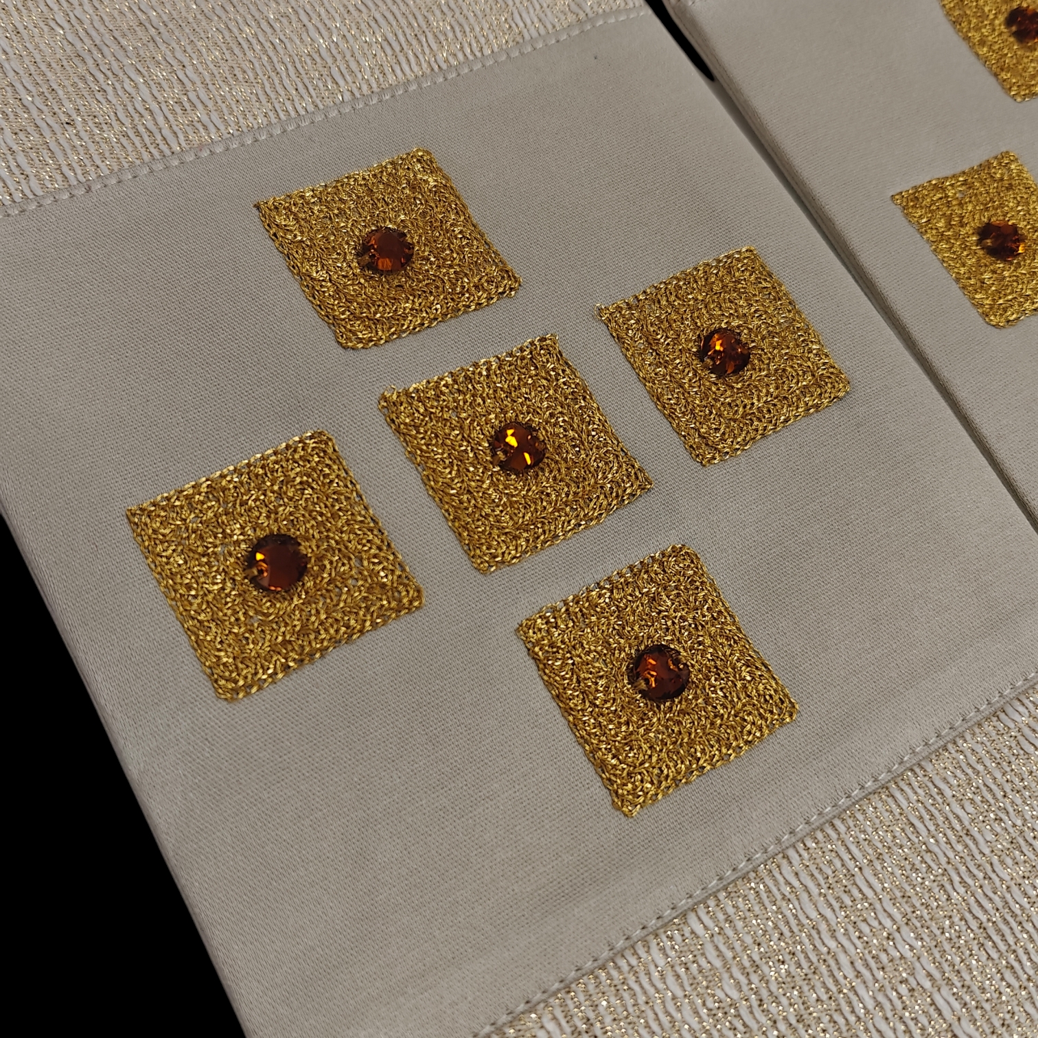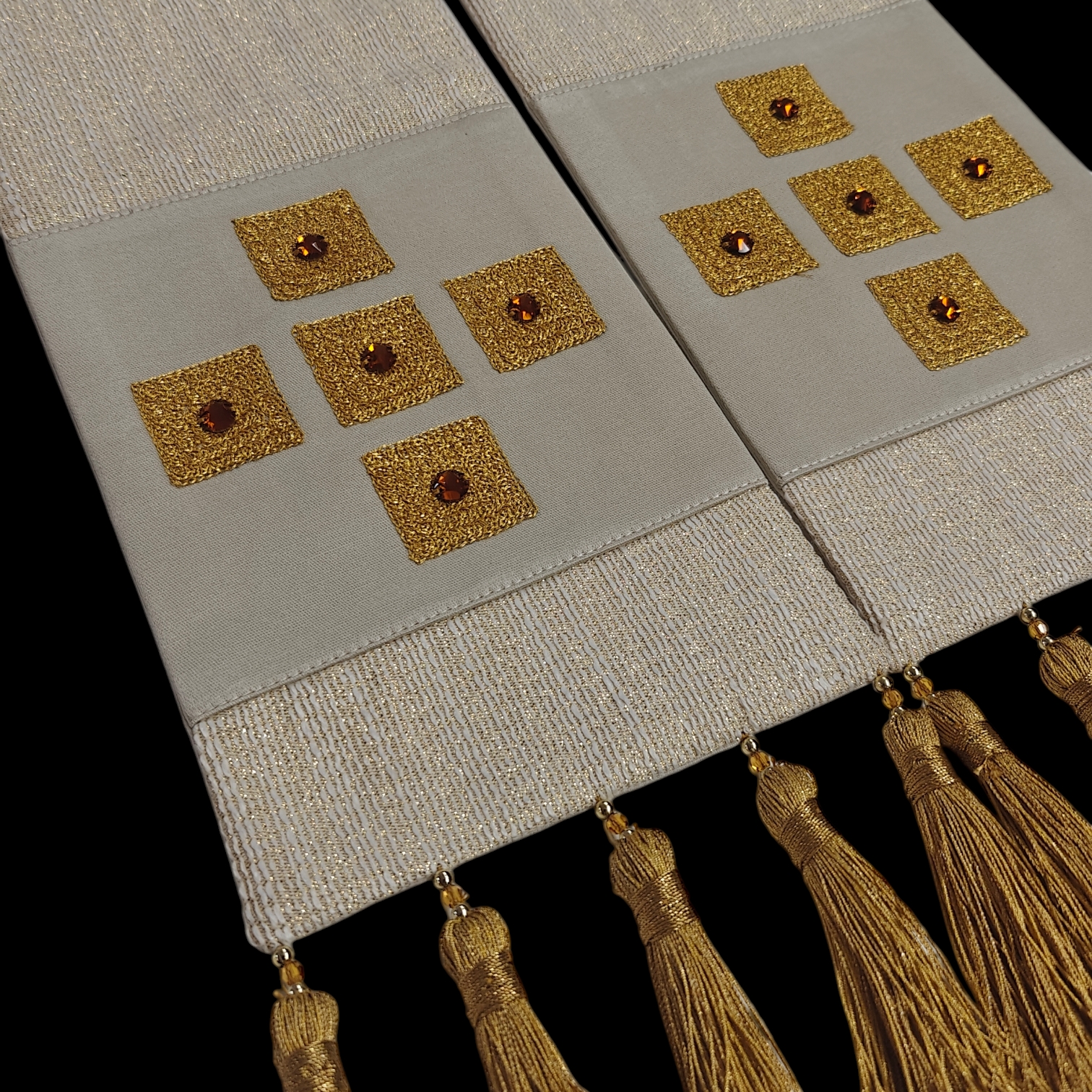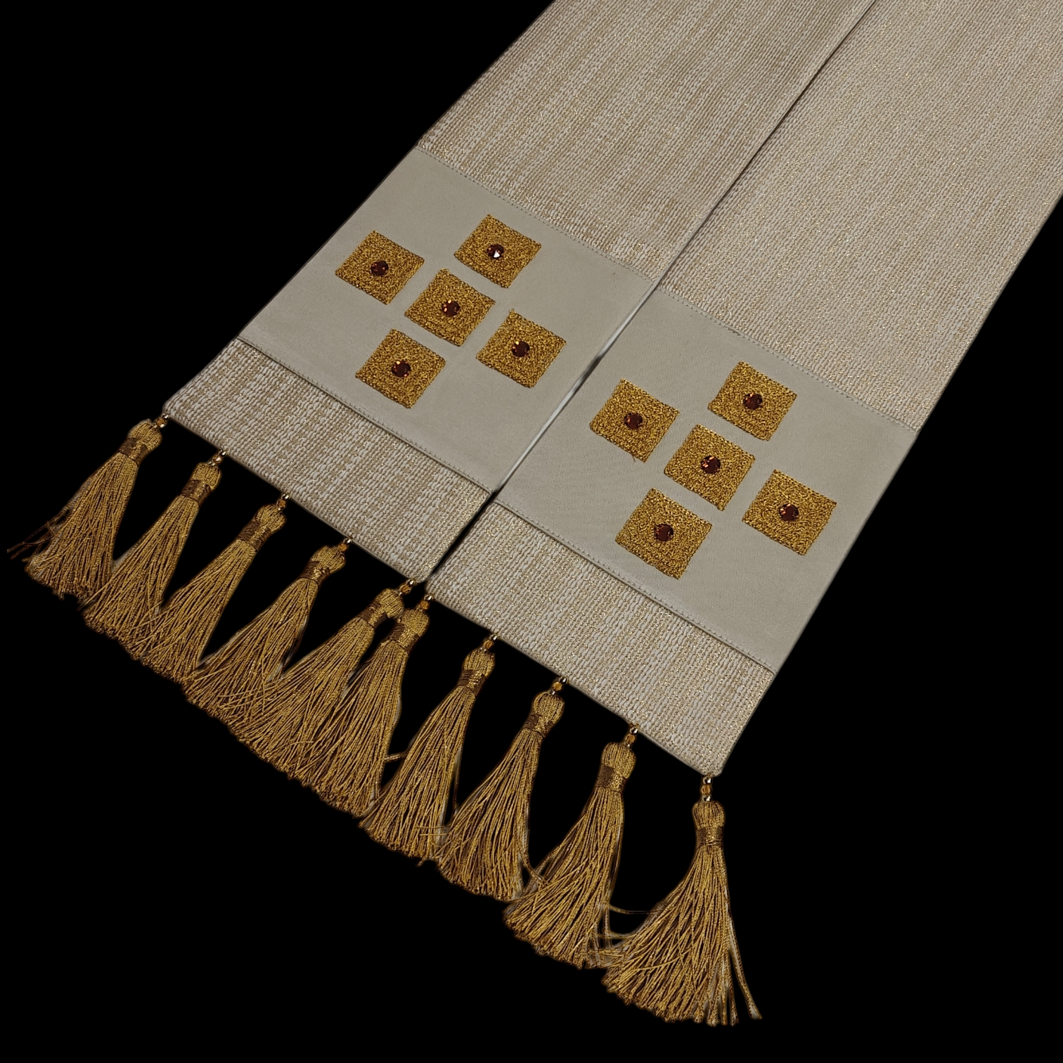Stola modello 034 realizzato su tessuto lana seta e lurex ricamato con filo in oro metallico con applicazione a mano di nappine e Swarovski .