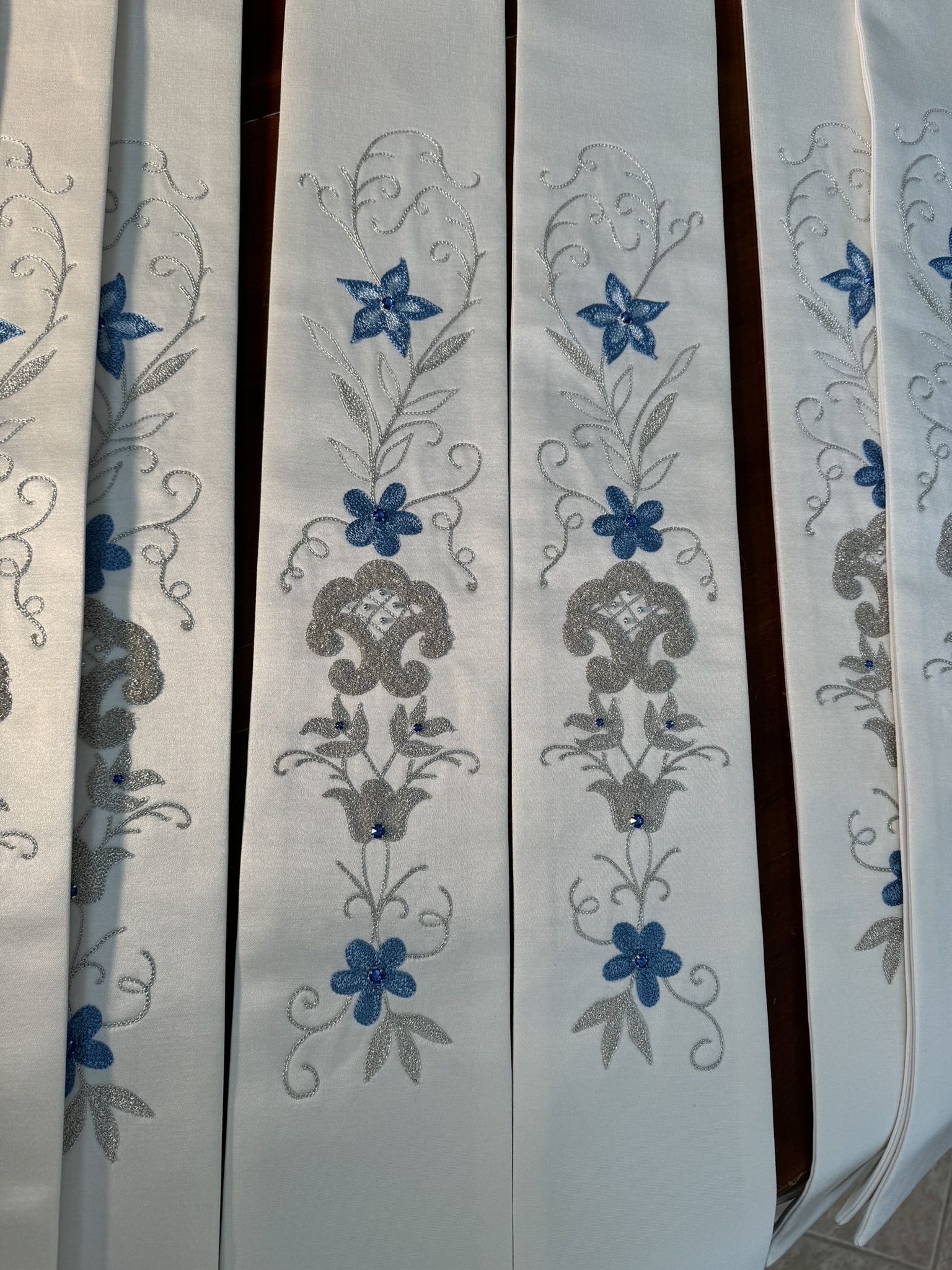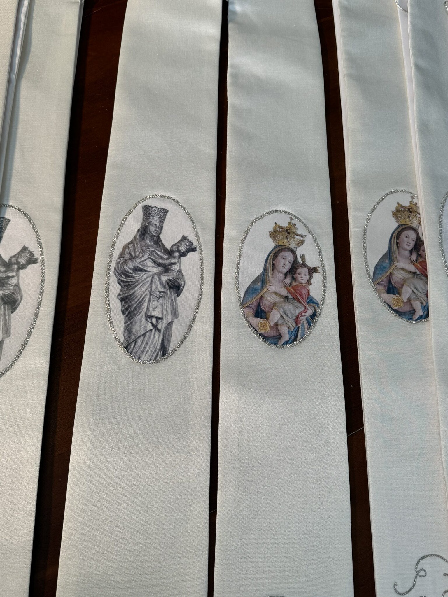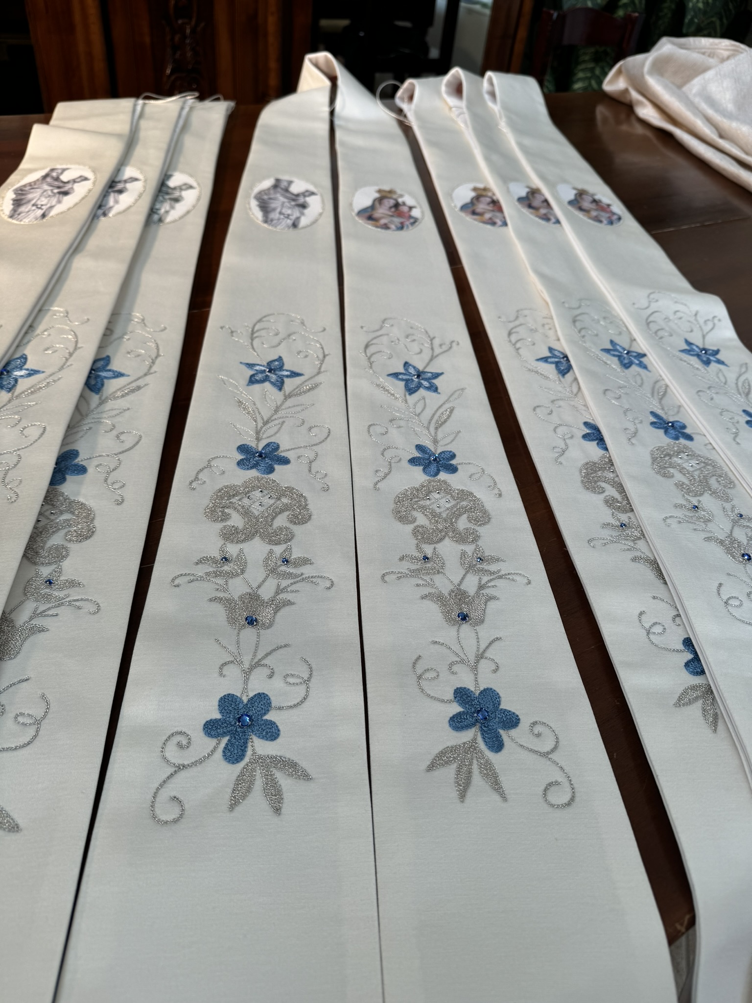 Stola modello medaglione realizzato su tessuto lana seta e lurex ricamato con filo in oro argento e seta celeste,con applicazione dell’immagine in sublimazione attraverso il ricamo e Swarovski .