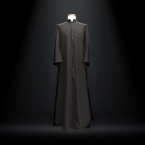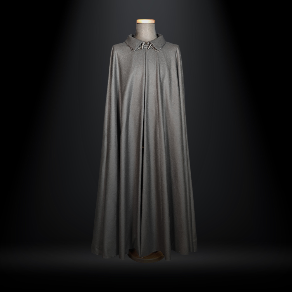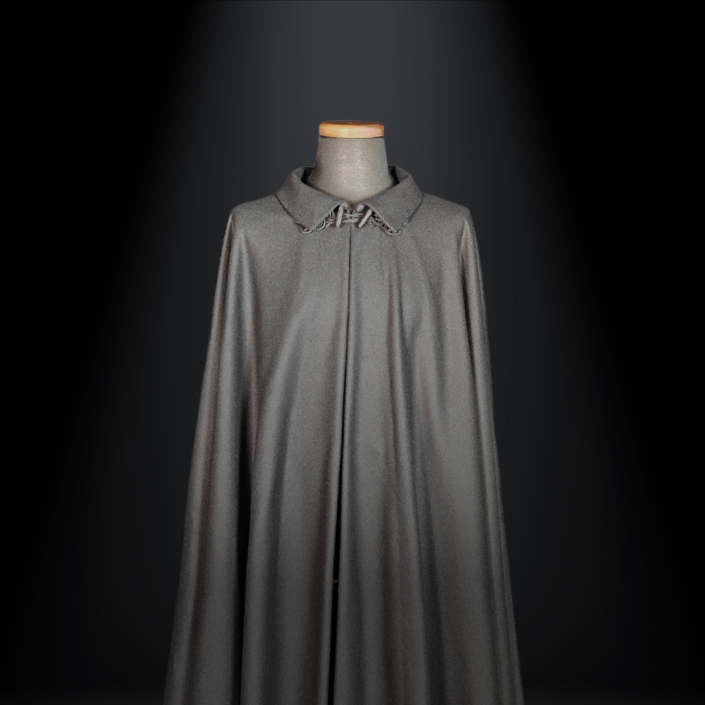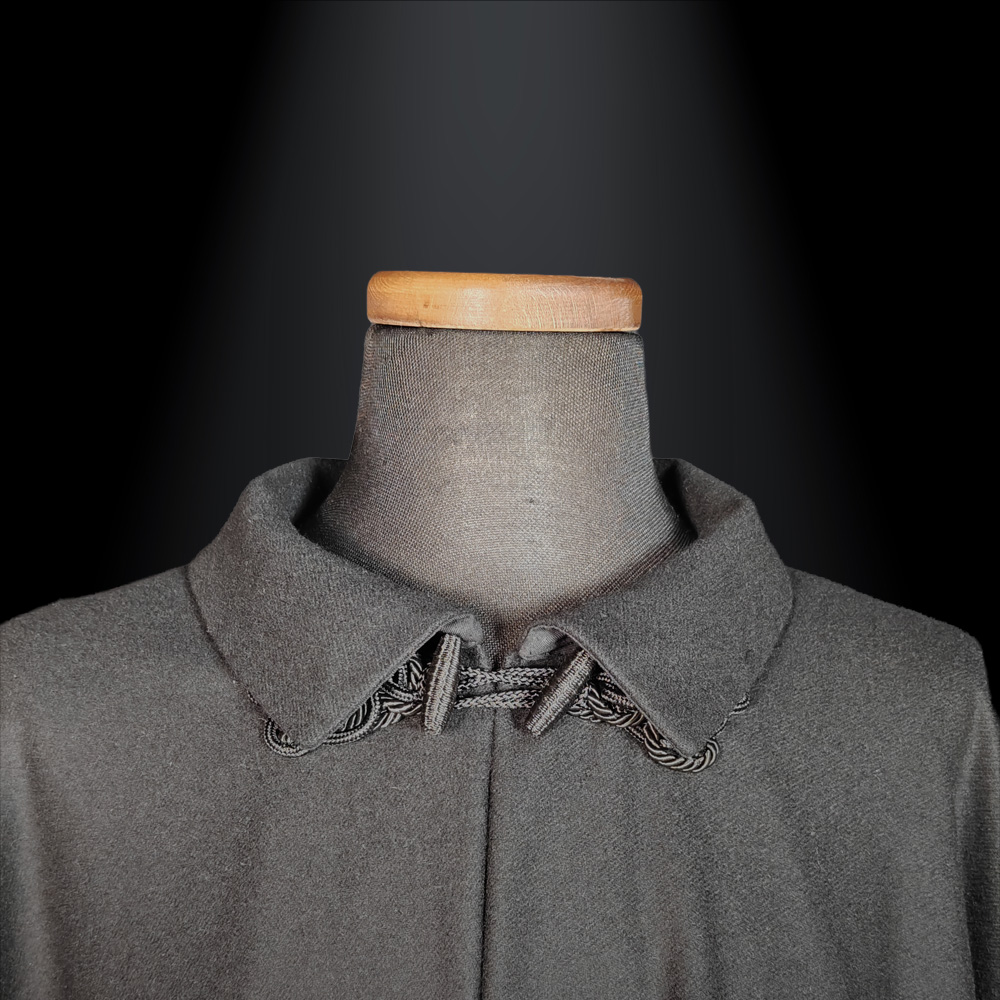 struttura può essere modulata su ogni corporatura e interpretata in due modi distinti. Nella versione a ruota intera il tabarro è ampio, ricco di cannelli, più caldo e scenografico. Permette di accavallare con naturalezza un lembo sulla spalla, avvolgendo completamente la persona in un gesto elegante e funzionale. È l’interpretazione più iconica, quella che esprime presenza e autorevolezza.Nella versione a mezza ruota la linea è più asciutta e leggera. I cannelli sono meno numerosi e il capo viene indossato più come una cappa. Proprio questa apparente essenzialità rende la costruzione ancora più delicata, perché l’equilibrio deve essere perfetto per mantenere armonia e proporzione.Ogni tabarro può essere realizzato all’altezza desiderata, lungo fino alla caviglia o a mezza gamba, sempre in proporzione alla figura di chi lo indosserà. Il modello presentato oggi è confezionato in pura lana vergine da 360 grammi al metro quadro, un peso ideale per garantire struttura, calore e fluidità senza appesantire. Gli alamari sono realizzati interamente a mano, perché nei dettagli si riconosce la vera sartorialità.